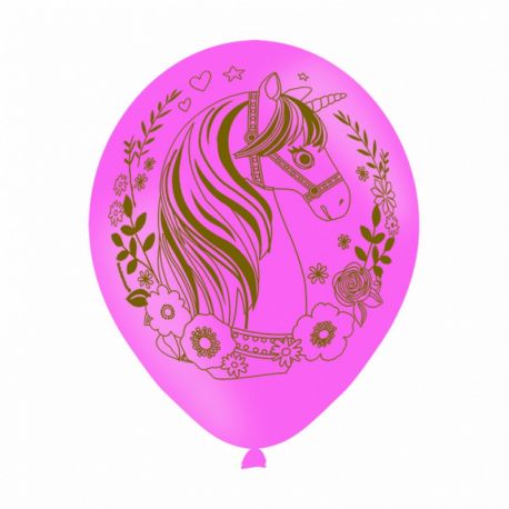 Pack contenant 6 ballons rose à motif licorne magique en matière latex et de 25 cm de diamètre.