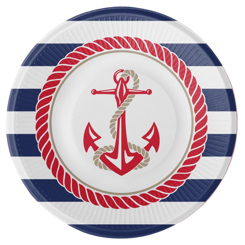 Pack contenant 8 assiettes en carton à motifs marins avec un gouvernail, de 18 cm de diamètre.