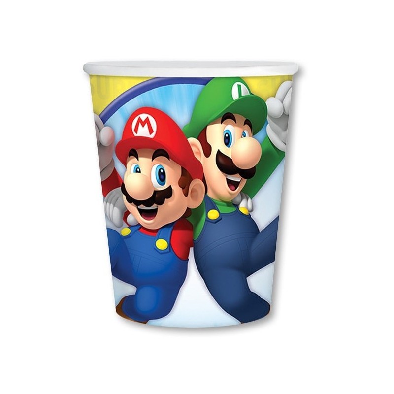 Vous voulez offrir à vos invités des gobelets de qualité ? Et pourquoi pas sur le thème de Mario, le célèbre plombier à moustache qui saute sur des champignons. Les gobelets anniversaire Mario Bros pas chers sont vendus par lots de 8, en matière carton avec une contenance de 266 ml, pour vos boissons chaudes, froides ou même tièdes.