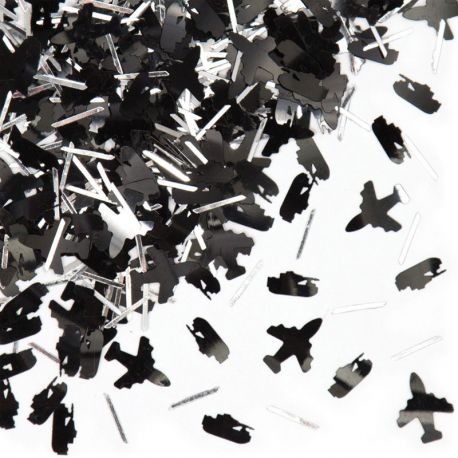 Sachet de 14 gr de confettis noirs métallisés thème militaire représentant des chars, avions de chasse et bateaux.
