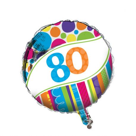 Un ballon d'anniversaire rond en mylar rond à motifs rayures et pois multicolores de 45 cm avec l'inscription 80.