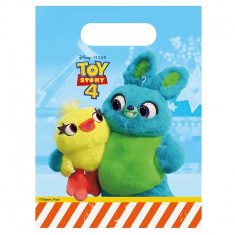 Pack contenant 6 sachets en plastique pour bonbons sur le thème du film Toy Story 4 avec deux peluches.