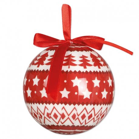 Un pack de 6 boules de Noël en plastique à motifs d'étoiles et de sapin rouges et blancs de 6 cm de diamètre.