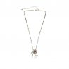 Un pendentif en métal de main de squelette avec une fausse pierre rouge au centre au bout d'une chaîne.