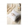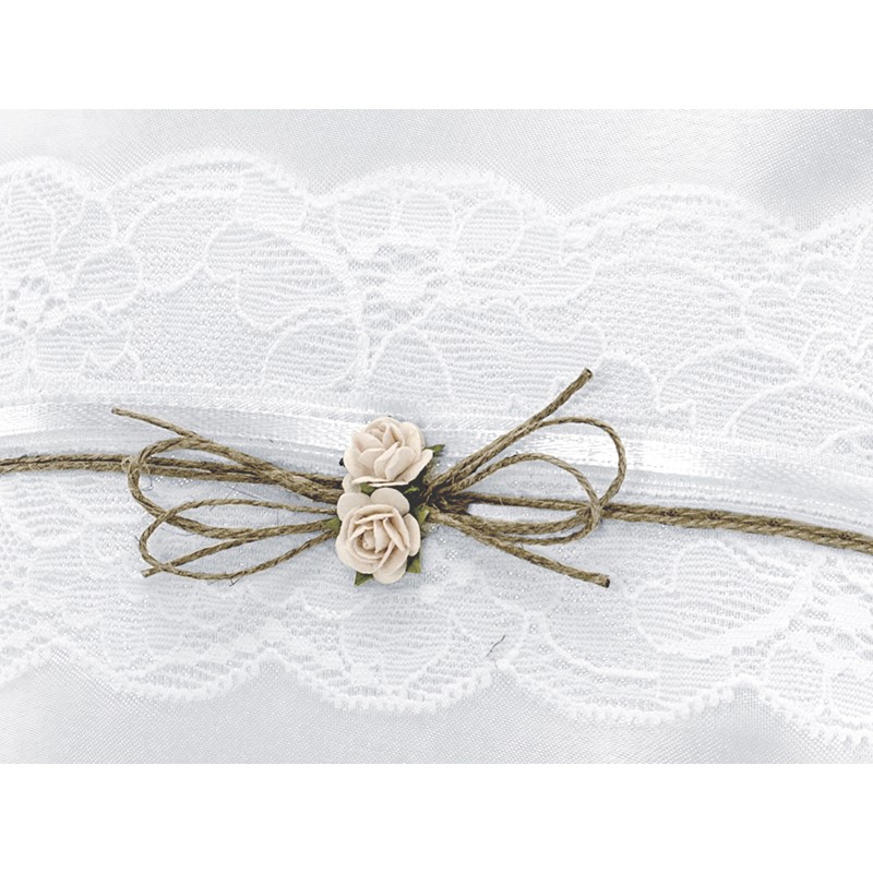 Un coussin d'alliances de mariage en tissu blanc avec de la dentelle et fleurs blanches de 16 cm x 16 cm.