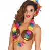 Un collier avec des petites fleurs tropicales et multicolores en plastique sur le thème Hawaïen.