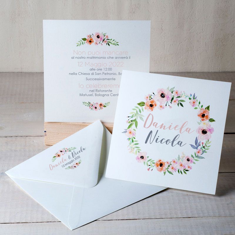 Pack contenant 25 faire-parts vierges de couleur blanche avec enveloppe décorés d'une couronne de fleurs au centre.