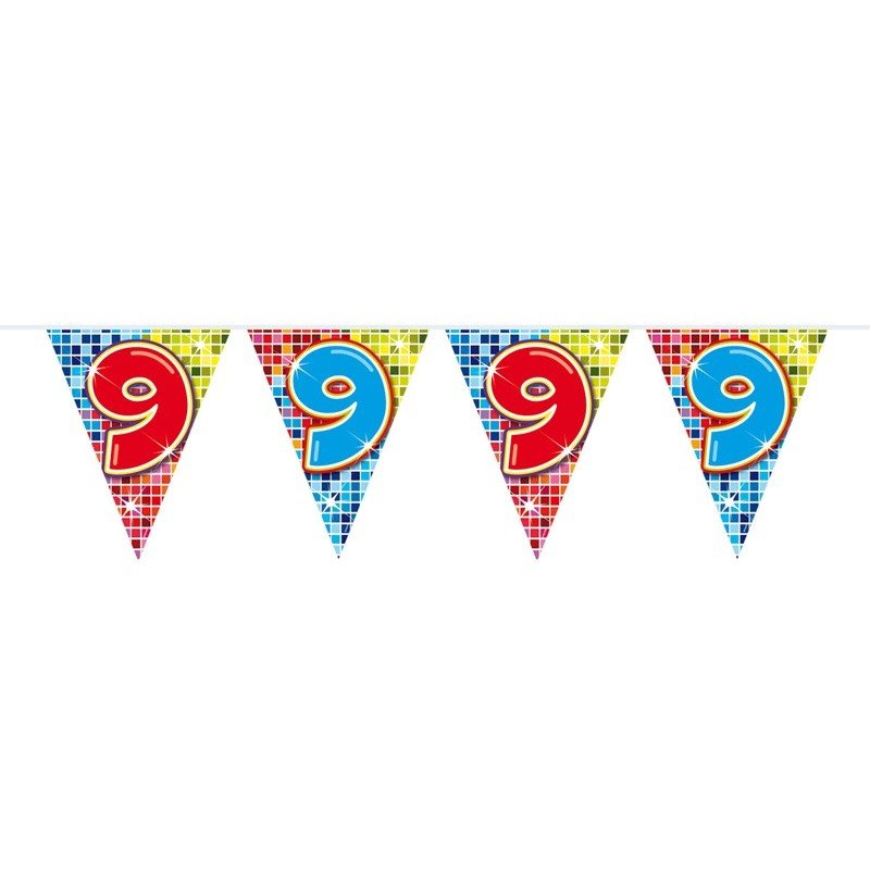 Une guirlande de fanions triangulaires en plastique colorés avec le numéro 9 de 6 m de longueur et 29 cm de largeur.