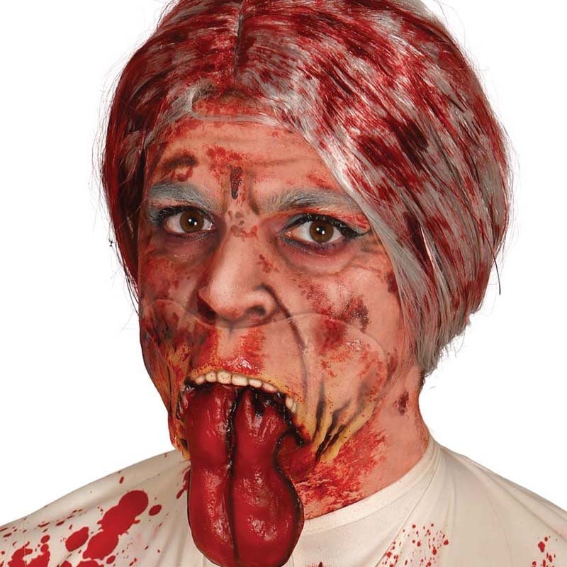 Une prothèse immitant une machoire brisée et ensanglantée en latexavec adhésif cutané pour compléter un costume.