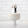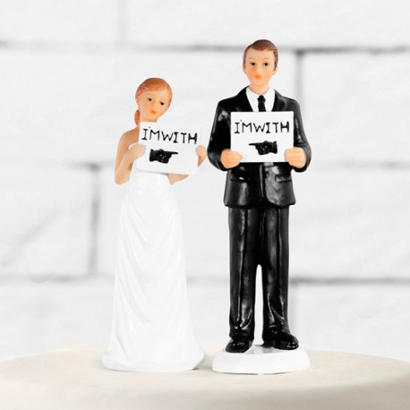 Une figurine de mariage en résine pour gâteau avec les mariés tenant chancun une pancarte I'm With de 14 cm de haut.