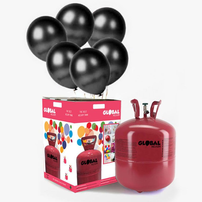 Un Pack contenant 1 Bouteille d'Hélium Jetable Grande + 50 ballons métallisés de 25cm de couleurs variées.