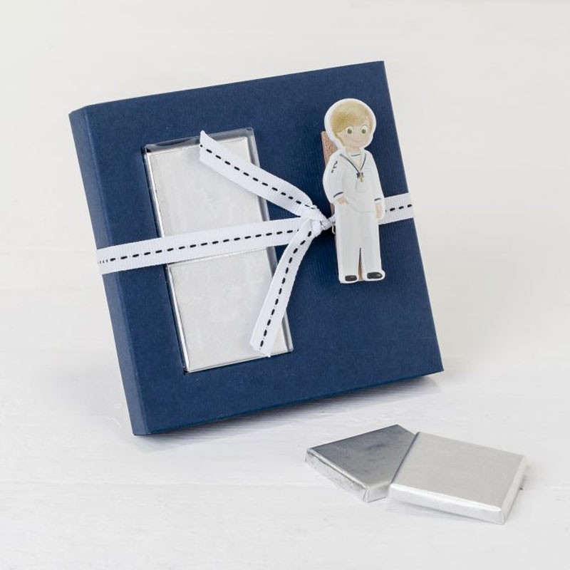 Boîte bleue contenant 2 carrés de chocolat avec un ruban et une pince en forme de garçon marin accrochée.