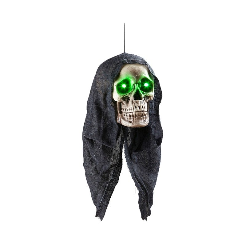 Une figurine à suspendre d'un crâne lumineux avec un voile, en plastique et tissu de 90 cm de haut.