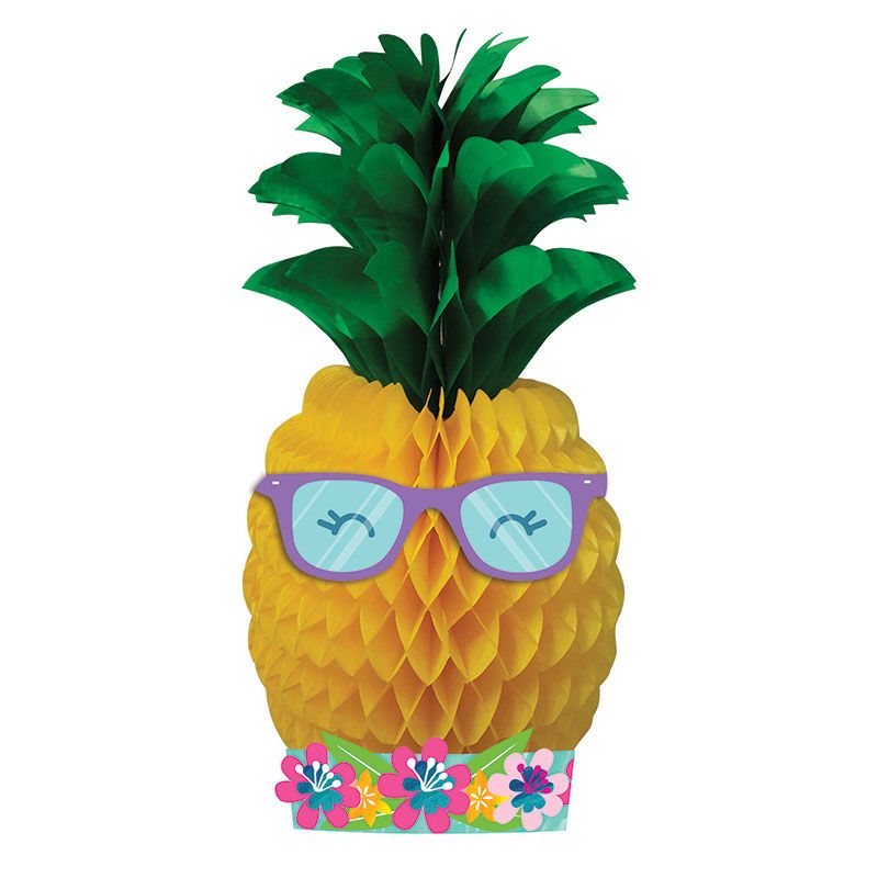 Un centre de table en papier représentant une ananas avec des lunettes et des fleurs pour un thème exotique.