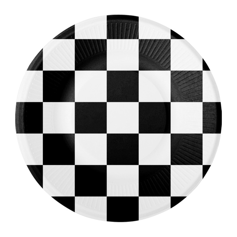 Pack contenant 8 assiettes en carton noires et blanches sur le thème formule 1 et de 18 cm de diamètre.